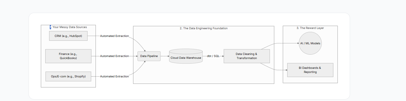 Data Engineering is the unsexy, blue-collar work of the tech world. It's the plumbing. It is the process of extracting data from your messy silos, cleaning it, standardizing it, and moving it into a centralized hub so that the AI actually knows what is going on in your business.